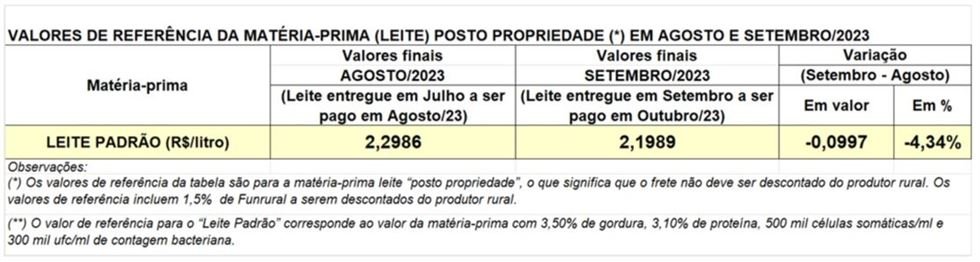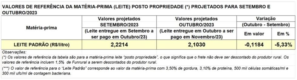 A diretoria do Conseleite-Paraná, reunida no dia 24 de outubro de 2023 na sede da FAEP, em Curitiba, atendendo os dispositivos disciplinados no Capítulo II do Título II do seu Regulamento, aprova e divulga os valores de referência para a matéria-prima leite realizados em setembro de 2023 e a projeção dos valores de referência para o mês de outubro de 2023, calculados por metodologia definida pelo Conseleite-Paraná, a partir dos preços médios e do mix de comercialização dos derivados lácteos praticados pelas empresas participantes.