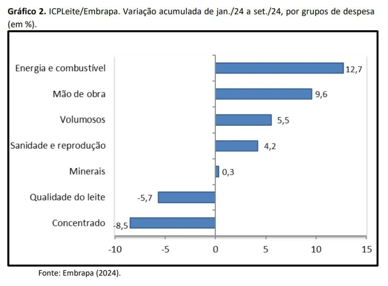 Em sentido contrário outros cinco grupos de custos, que compõem o ICPLeite/Embrapa, apresentaram inflação. O grupo Energia e combustível acumulou 12,7% nos nove primeiros meses do ano, seguido por Mão de obra, com 9,6%. O grupo Volumosos teve variação expressiva, de 5,5%, seguida de Sanidade e reprodução, de 4,2% e Minerais, de 0,3. Os dados constam do Gráfico 2.