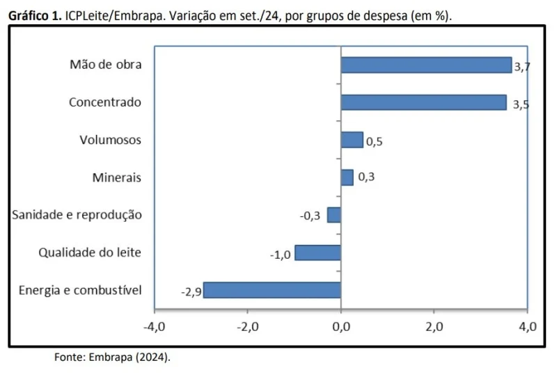 O custo de produção de leite cresceu 2,0%. Este é o quinto mês consecutivo que o ICPLeite/Embrapa registra aumento, acumulando 5,6% de elevação desde abril