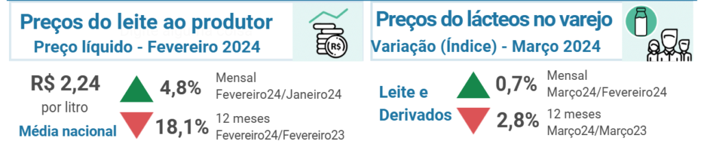 O preço do leite ao produtor continuou na trajetória de recuperação: aumentou 4,8% em fevereiro/24. O preço médio nacional, que ficou em R$ 2,24 por litro, ainda é 18,1% inferior ao observado em fevereiro/23.