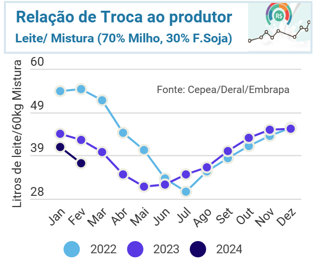 A relação de troca leite/mistura melhorou em fevereiro/24, tanto quando comparada ao mês anterior quanto ao mês de fevereiro/23. Foram necessários 36,8 litros de leite para aquisição de 60 kg de mistura, contra 42,4 litros observados em fevereiro/23.
