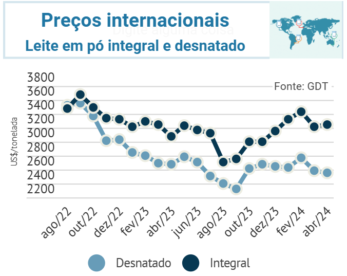 O preço internacional do leite em pó integral apresentou ligeiro aumento e foi cotado a US$ 3.246/tonelada no início de abril/24. O preço leite em pó desnatado, no entanto, se reduziu, alcançando US$ 2.550/tonelada.