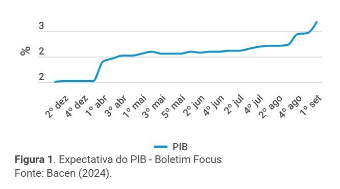 Os indicadores macroeconômicos brasileiros estão favoráveis ao crescimento da economia no curto prazo. O crescimento do último trimestre surpreendeu positivamente os analistas, que revisaram a previsão de aumento do PIB para 2,68% em 2024 (Figura 1). A taxa de desocupação dos trabalhadores já é considerada a menor para o trimestre encerrado em julho, desde o começo da pesquisa em 2012. A massa real de salários também segue alta. Por fim, a inflação de agosto, medida pelo IPCA, apresentou uma queda de 0,02%. Entretanto, a previsão é de aumento na taxa Selic, para evitar um possível descolamento da inflação de sua meta, já que há mais dinheiro disponível no mercado.