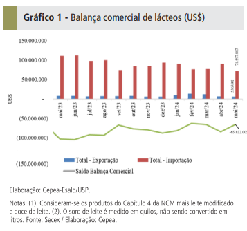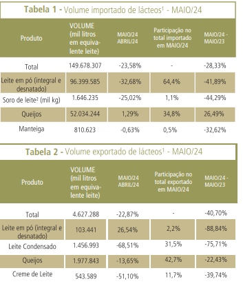 As exportações também diminuíram, 22,87% no comparativo mensal e 40,7% no anual. Como resultado, o déficit da balança comercial (em volume) recuou 23,6%, de abril para maio, para aproximadamente 145 milhões de litros em equivalente leite, gerando um saldo negativo de US$ 65,8 milhões em maio.