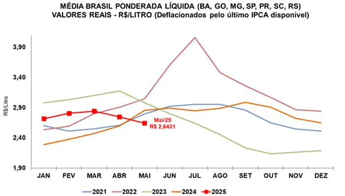 Gráfico 1. Série de preços médios recebidos pelo produtor (líquido), em valores reais (deflacionados pelo IPCA de maio/2025)