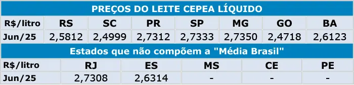 Cotações de leite cru – Preços pagos pelos laticínios e recebidos pelos produtores (líquido) em Junho/25 referentes ao leite entregue em Maio/25 nos estados que compõem e não compõem a “Média Brasil”. Dados deflacionados pelo IPCA de Maio de 2025. A “Média Brasil” líquida contém os preços de BA, GO, MG, SP, PR, SC e RS ponderados pelos seus respectivos volumes de negociação, sem considerar frete ou impostos. Demais estados RJ, ES, MS, CE e PE não estão incluídos na “Média Brasil”.