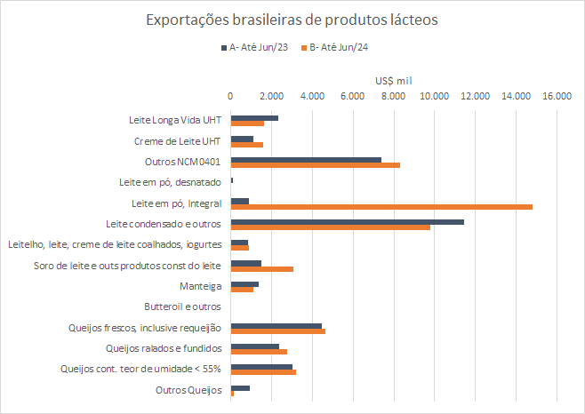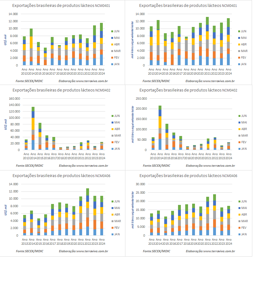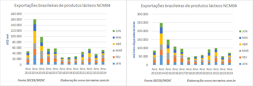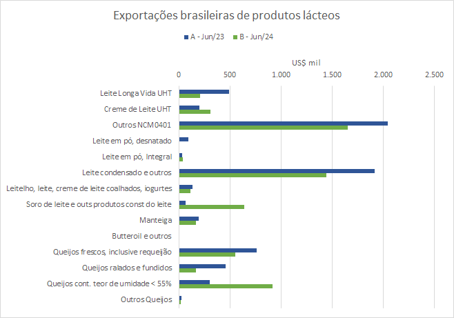 As exportações brasileiras de produtos lácteos NCM04, no mês de junho de 2024 caíram -7,3%, em relação ao mesmo mês de 2023, em valores, embora tenham aumentado 2,0% em volume.