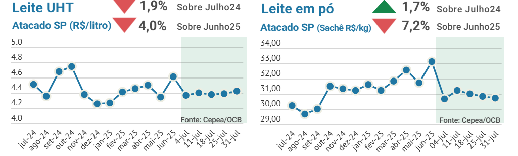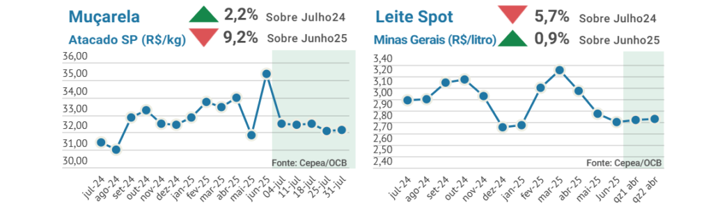 Os preços dos lácteos apresentaram baixas no mês de julho, refletindo um volume relativamente alto da oferta, apesar da entressafra, e uma competição em preços mais forte entre os laticínios, sobretudo no leite UHT e queijo muçarela. Estoques um pouco mais altos no mercado de leite UHT também influenciaram na queda de preços. O mercado de leite em pó segue afetado pelas importações e uma maior oferta doméstica, sem sustentação na demanda. Neste contexto, o mercado de leite Spot se manteve mais baixo e com tendência de recuo devido a aproximação da safra na maior parte do País.